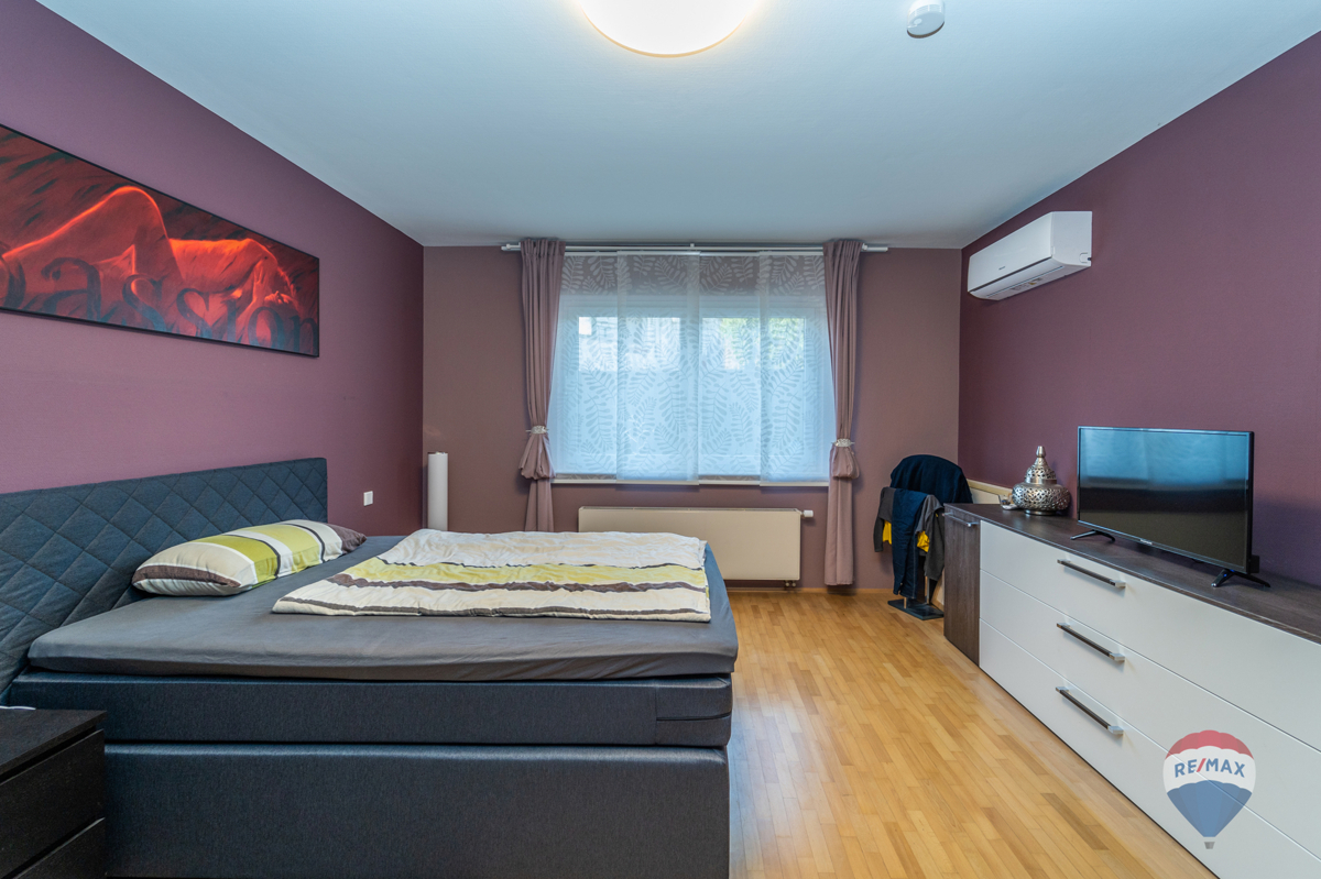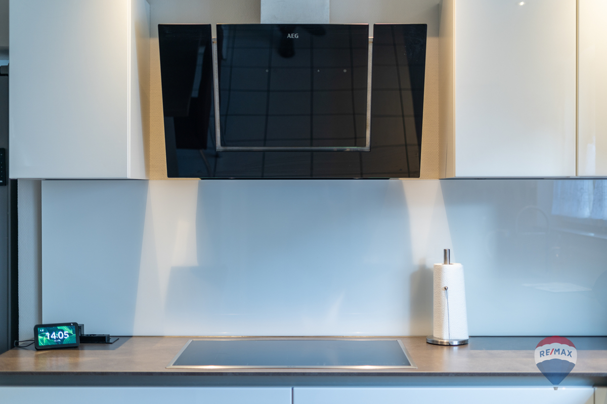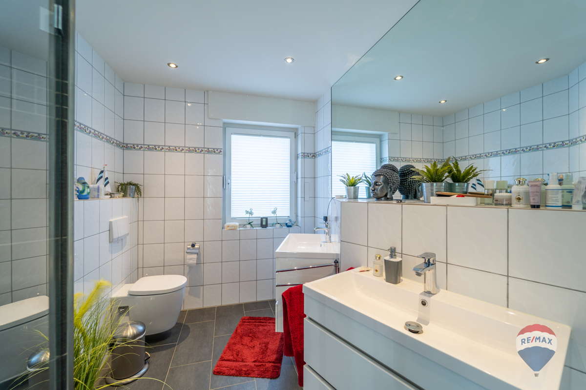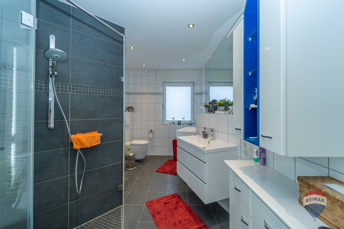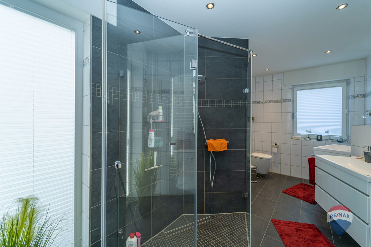 Das luxuriöse Badezimmer wurde folgendermaßen ausgestattet: 2 Handwaschbecken, WC und einen erdebenen, großen Duschbereich. Ein Gäste-WC und ein Abstellraum komplettieren diese Etage.