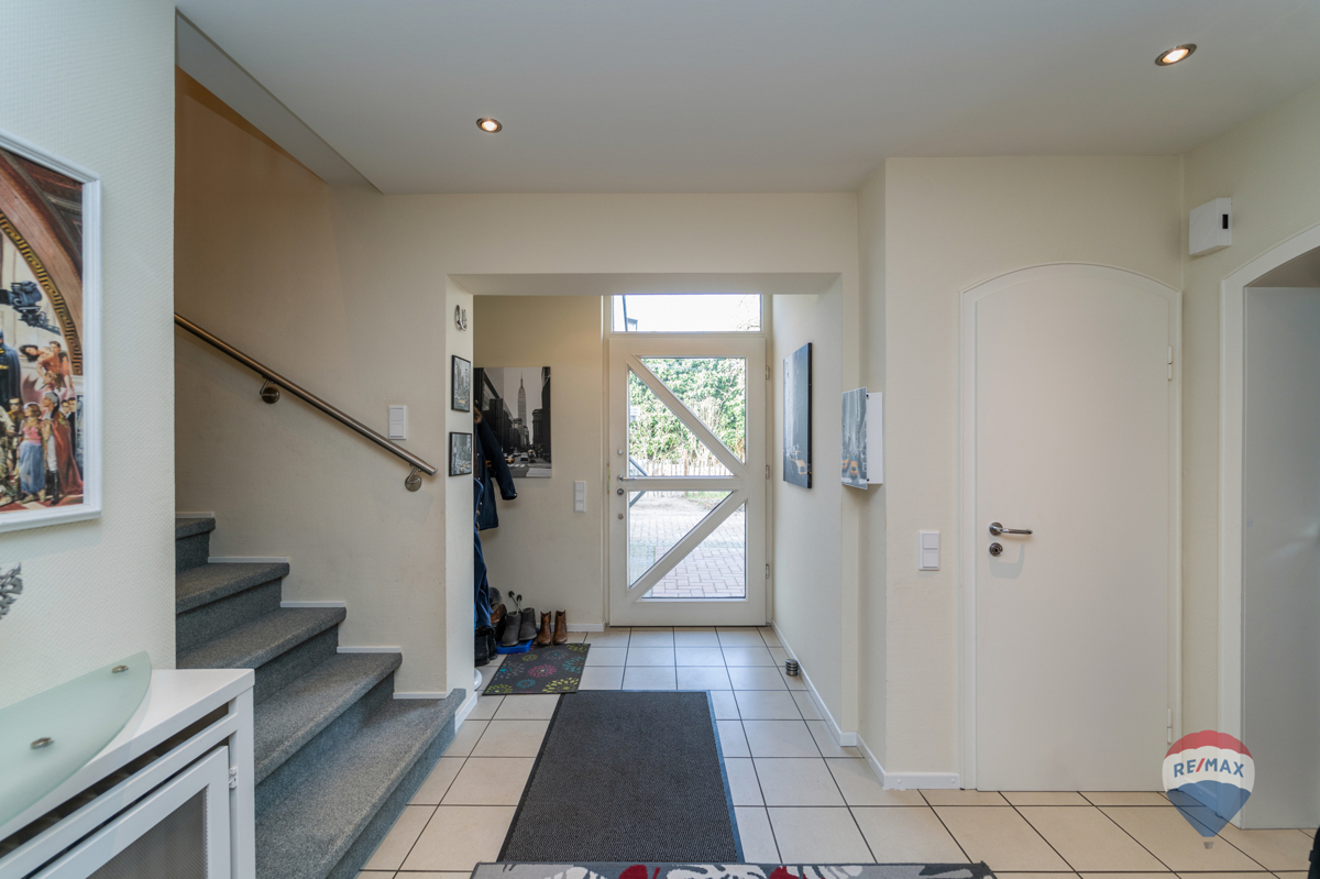 Die große Diele mit integrierten Treppen zum Obergeschoss lässt schon beim Betreten Großzügigkeit erahnen. Mittelpunkt und somit den Familientreffpunkt stellt das geräumige Wohnzimmer dar. Ein Kamin sorgt im Winter für wohlige Stunden. Großzügige Fensterelemente sorgen für viel Helligkeit und ein Ausgang bietet die Gartenzutrittsmöglichkeit. Das Esszimmer verfügt ebenfalls über eine ansprechende Größe und befindet sich neben der Küche. Die Küche wurde mit einer hochwertigen Einbauküche dreiseitig bestückt. Diese kann optional von den jetzigen Eigentümern nach Verhandlung übernommen werden. Ein Essplatz findet hier spielend Unterbringung. Angrenzend befindet sich praktischerweise der Hauswirtschaftsraum, der ebenfalls über einen Zugang zur Terrasse und Garten verfügt. Ein Schlafzimmer von ansprechender Größe befindet sich hier im Erdgeschoss. In der Küche, im Badezimmer und Diele wurden Bodenfliesen, ansonsten wurde hier hochwertiger Parkettboden verlegt.
