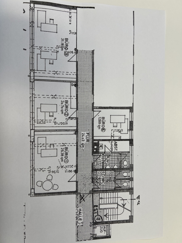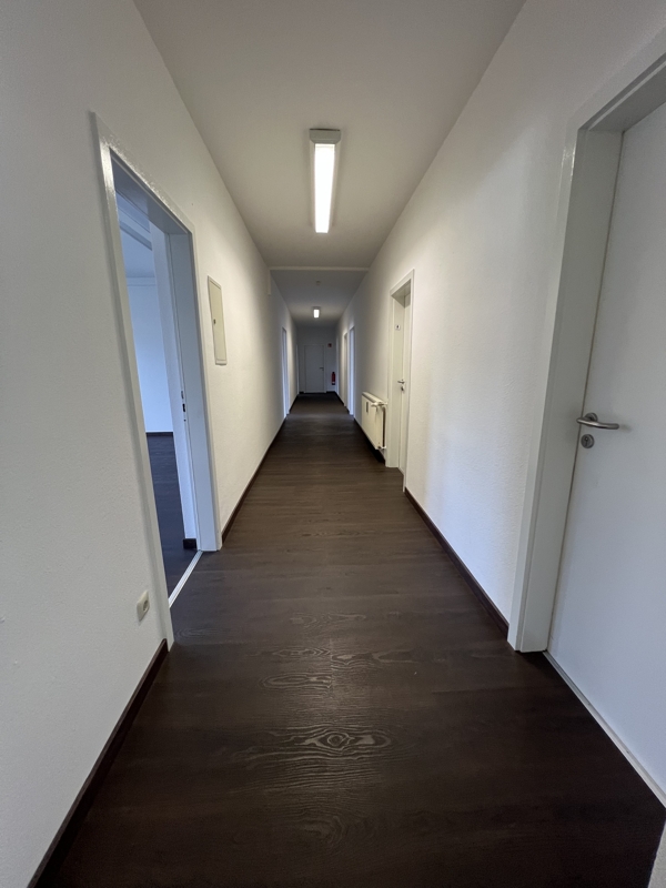Auf 120,38 qm werden 3 Büros angeboten. Diese sind 31,18 qm, 20,70 qm und 26,38 qm groß. Auf der anderen Flurseite befindet sich ein 12,89 qm großer Kantinen/Küchenraum der ebenfalls noch als Büro genutzt werden könnte. Das Herren WC hat 2 Urinale und das Damen WC zwei getrennte Toiletten. Darüber hinaus gibt es noch einen kleinen Abstellraum.
