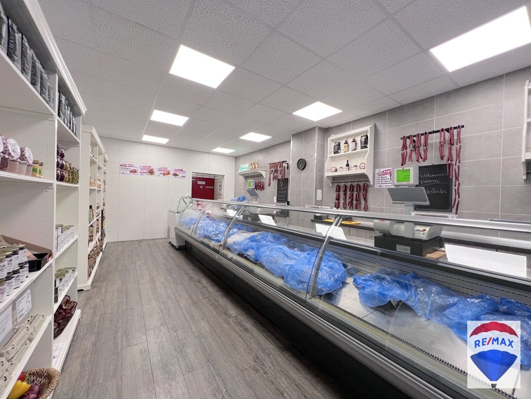 Das Erdgeschoss verfügt über einen geräumigen Verkaufsraum, eine Küche, Kühlraum und WC.