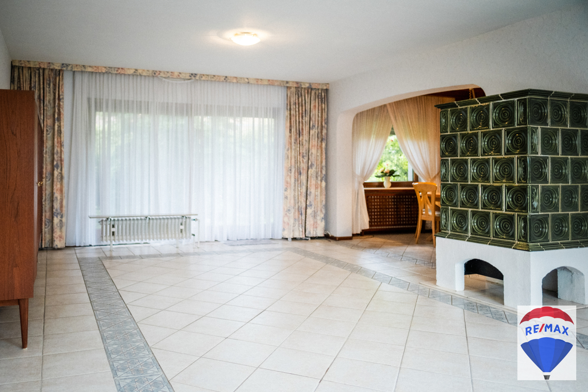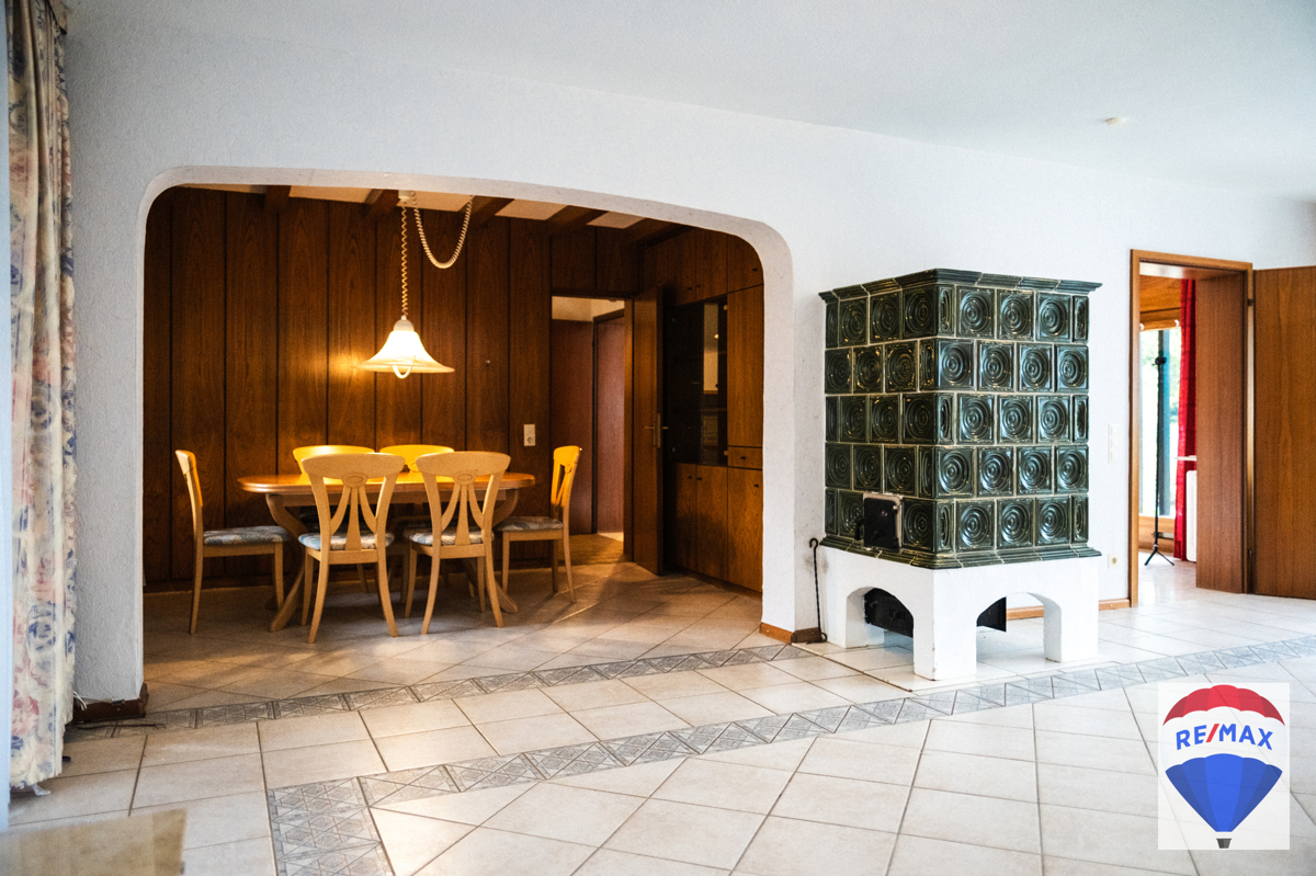 Großzügiges Wohn- und Esszimmer mit Kachelofen und Zugang zur Terrasse