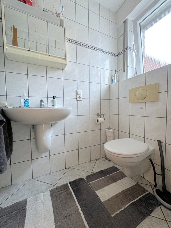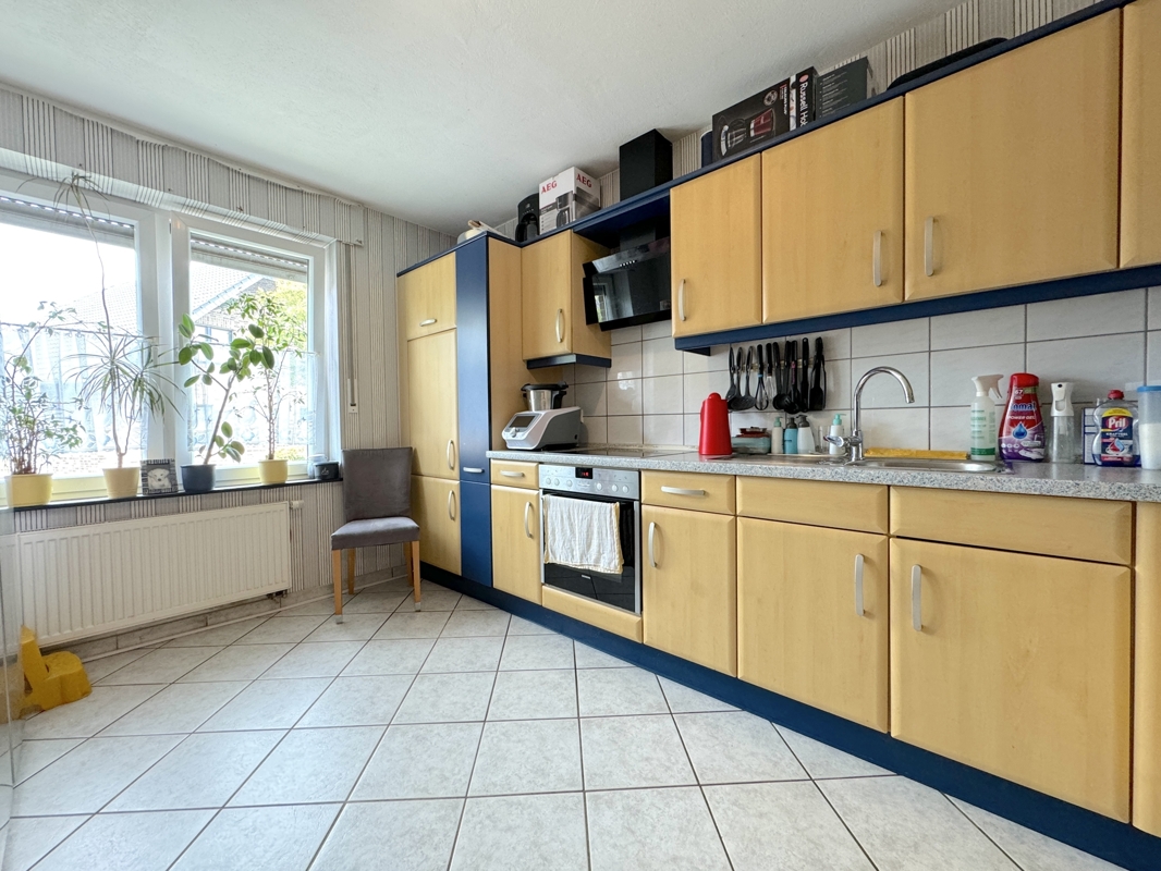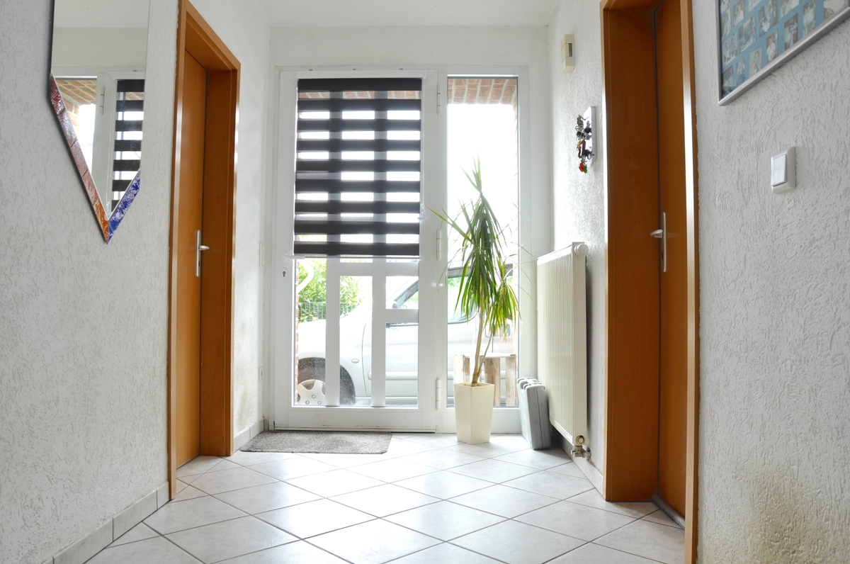 Von einem Eingangsbereich gelangt man in das Gäste-WC im aktuellem Stil. Die Küche bietet genügend Raum, um einen Essplatz zu integrieren.