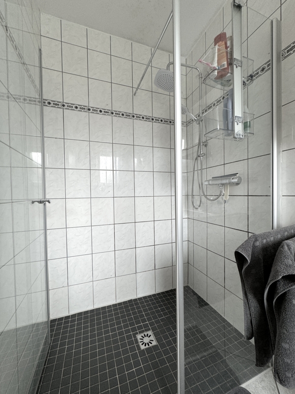 Das geräumige Wohn-Esszimmer ist zweifelsfrei der Mittelpunkt des Erdgeschosses. Lichtdurchflutetet bedingt durch bodentiefe Fensterfronten präsentiert es sich und gibt den Blick auf die Terrasse und den Garten frei. Ein uriger Kaminofen wärmt Sie hier an kalten Tagen und eine einzigartige Wohnatmosphäre entsteht hier. Über die Steintreppe gelangen Sie ins Obergeschoss. Dieses beherbergt einen Flurbereich, das Badezimmer und drei individuell zur nutzende Räumlichkeiten. Das hell geflieste Badezimmer wurde folgendermaßen ausgestattet: Handwaschbecken, WC, barrierefreie Dusche und eine Badewanne. Über wenige Stufen gelangen Sie in die nächste Wohnebene, das ausgebaute Dachgeschoss. Hier entstand ein geräumiges Studio, was so manchen Teenager begeistern wird. Ein Panoramafenster sorgt hier für reichlich Helligkeit und ist ein weiterer Eyecatcher.