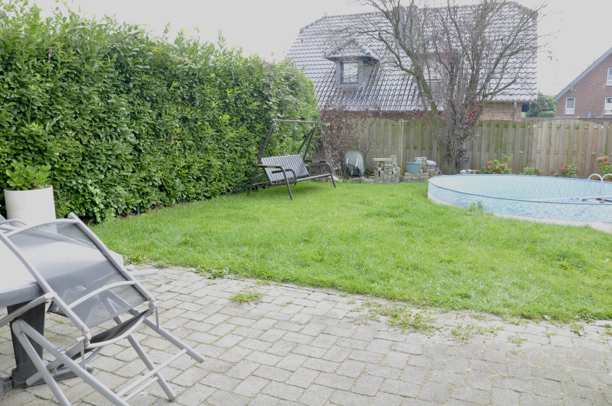 Das Grundstück wurde eingefriedet, der Garten ist teilweise von Hecken umsäumt und teilweise eingezäunt. Ein gemütlicher Terrassenbereich gewährt nach getaner Arbeit, Ruhe und Erholung. Der Garten verfügt über eine Rasenfläche und ein Swimmingpool wurde integriert.