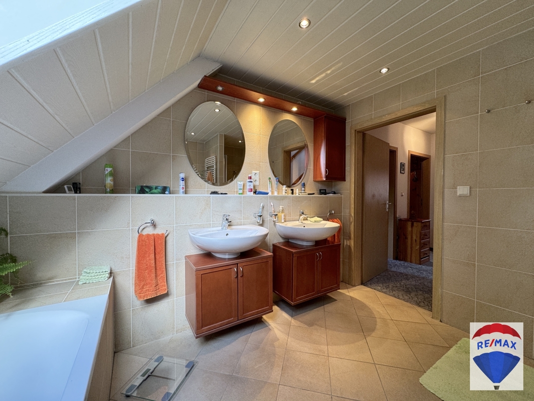 Über die schöne Buchentreppe gelangen Sie ins Obergeschoss. Dieses beherbergt drei großzügige Räumlichkeiten zur individuellen Nutzung, evtl. Kinderzimmer, Schlafzimmer, Gästezimmer oder Büro. Komplettiert wird diese Etage durch das hochwertig ausgestattete Badezimmer mit schöner Badewanne, WC, zwei Handwaschbecken und Dusche. Im Bad wurden die Wände und der Boden beige gefliest und das Fenster sorgt für reichlich Tageslicht.