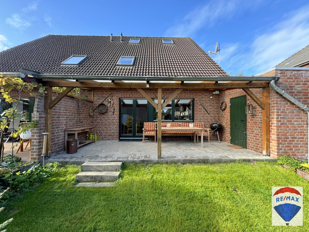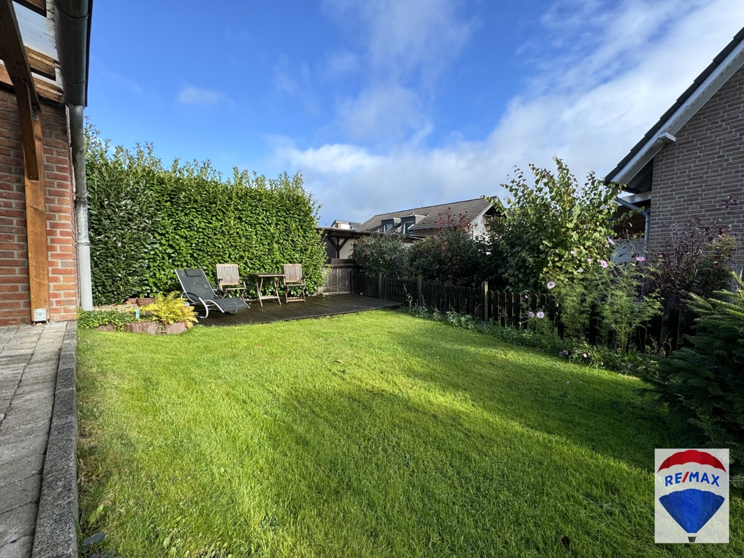 Die großzügig gepflasterte Terrasse verfügt über eine vollständige Überdachung, so dass man hier auch an Regentagen verweilen kann. Der Garten ist eingefriedet und wurde mit einer Rasenfläche und einer zweiten Sitzgelegenheit gestaltet.