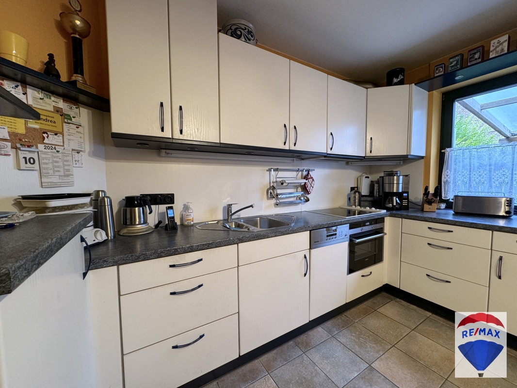 Von einem hellen Eingangsbereich mit Treppenaufgang gelangt man in den Küchenbereich. Die helle und beidseitig bestückte Einbauküche kann optional von den jetzigen Eigentümern nach Absprache übernommen werden. Den Mittelpunkt des Erdgeschosses bildet zweifelsfrei das angrenzende, großzügige Wohn-Esszimmer. Ein großes Fenster und der bodentiefe Ausgang auf die Terrasse lassen den Raum hell und freundlich erstrahlen. Diele, Küche, Gäste-WC und das Wohn-Esszimmer wurden mit hellen Bodenfliesen bestückt. Praktischerweise existiert auf dieser Etage noch ein Hauswirtschaftsraum mit Waschmaschinen-und Trockneranschluss, ein praktischer Abstellraum und das attraktive Gäste-WC im aktuellem Stil.