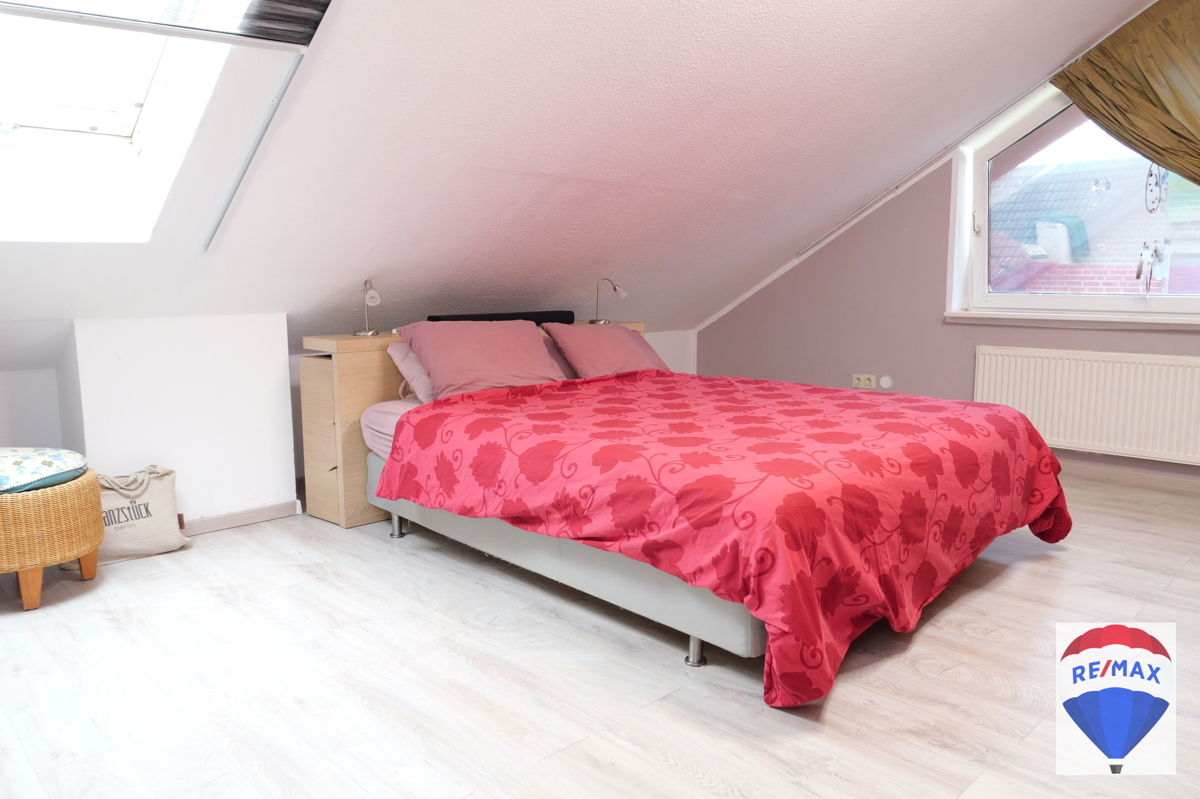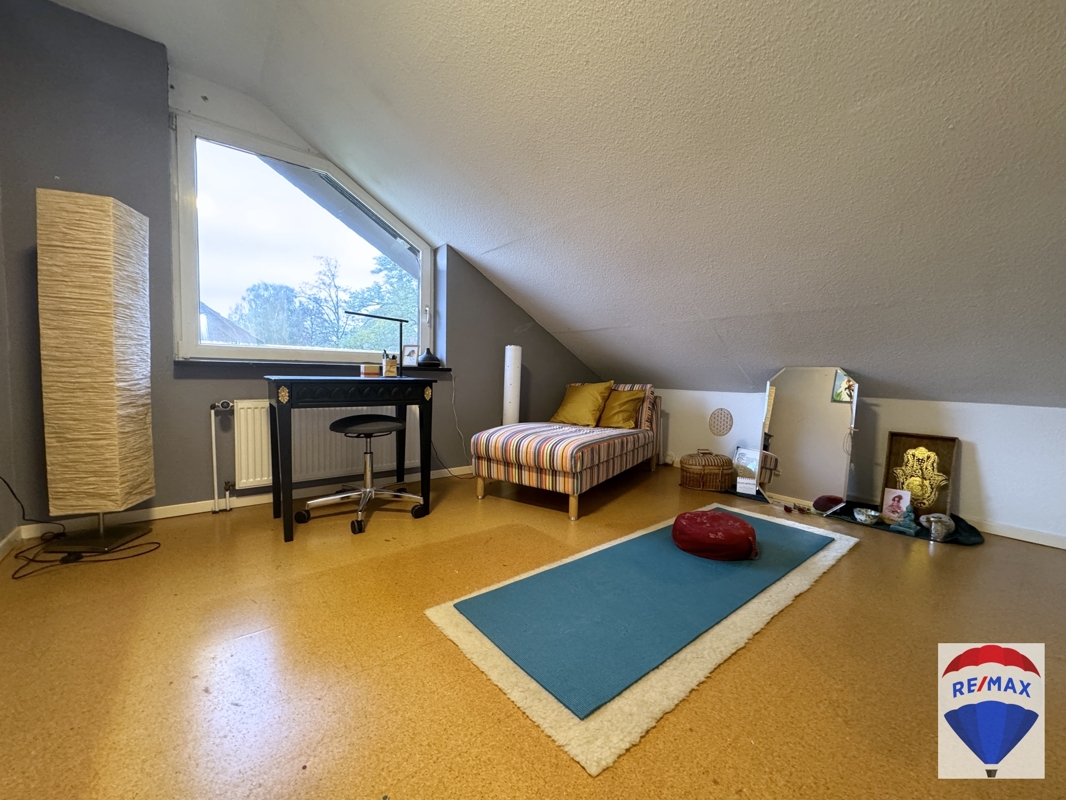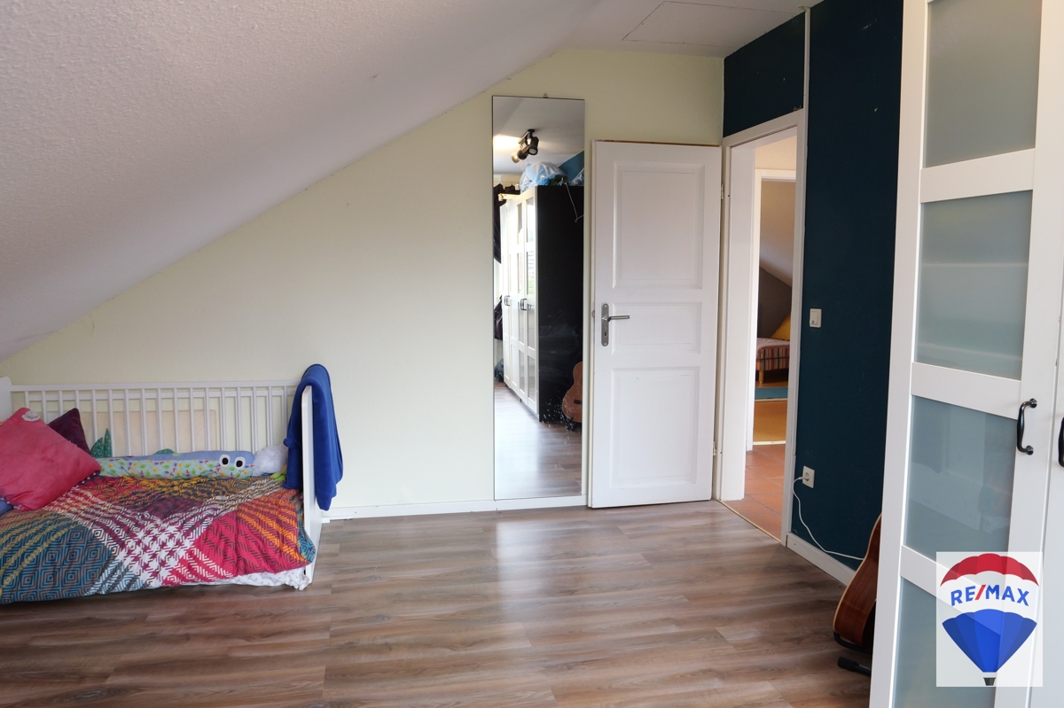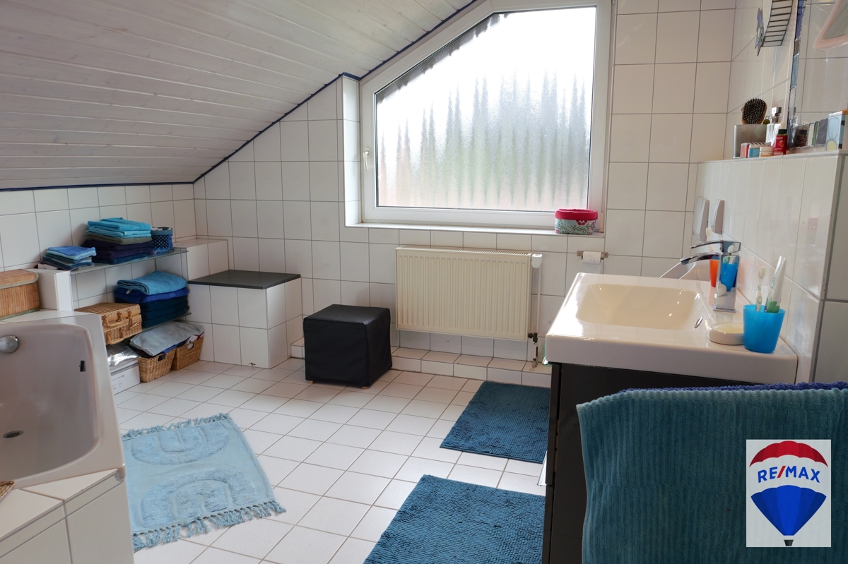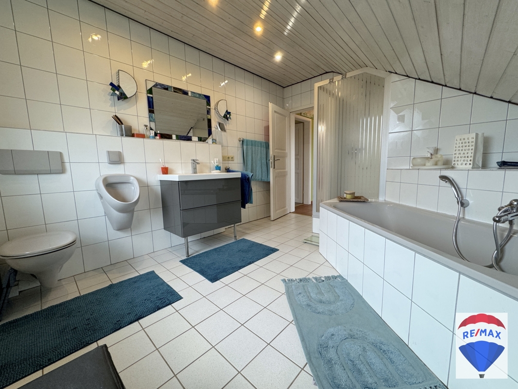 Über die schöne Buchentreppe gelangen Sie ins Obergeschoss. Dieses beherbergt drei großzügige Räumlichkeiten zur individuellen Nutzung, evtl. Kinderzimmer, Schlafzimmer, Gästezimmer oder Büro. Ein Schlafzimmer verfügt über eine Klimaanlage. Komplettiert wird diese Etage durch das hochwertig ausgestattete Badezimmer mit schöner Badewanne, WC, Urinal, Handwaschbecken und Dusche. Das Bad wurde mit einem praktischen Wäscheschacht ausgestattet.