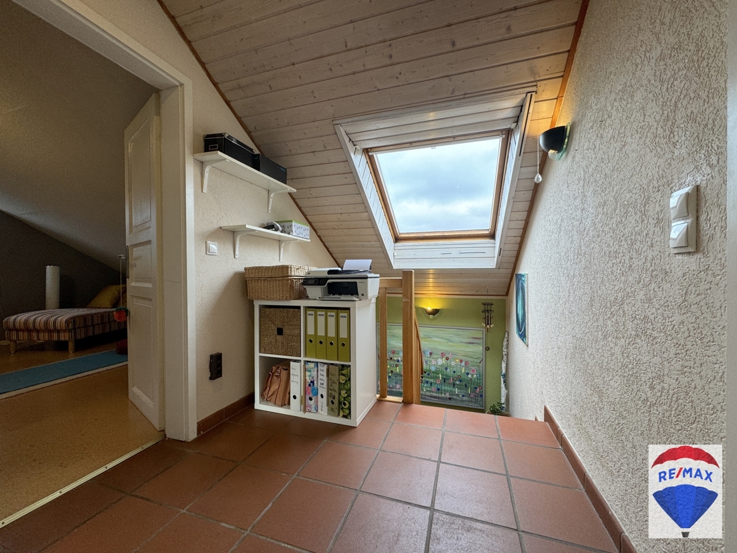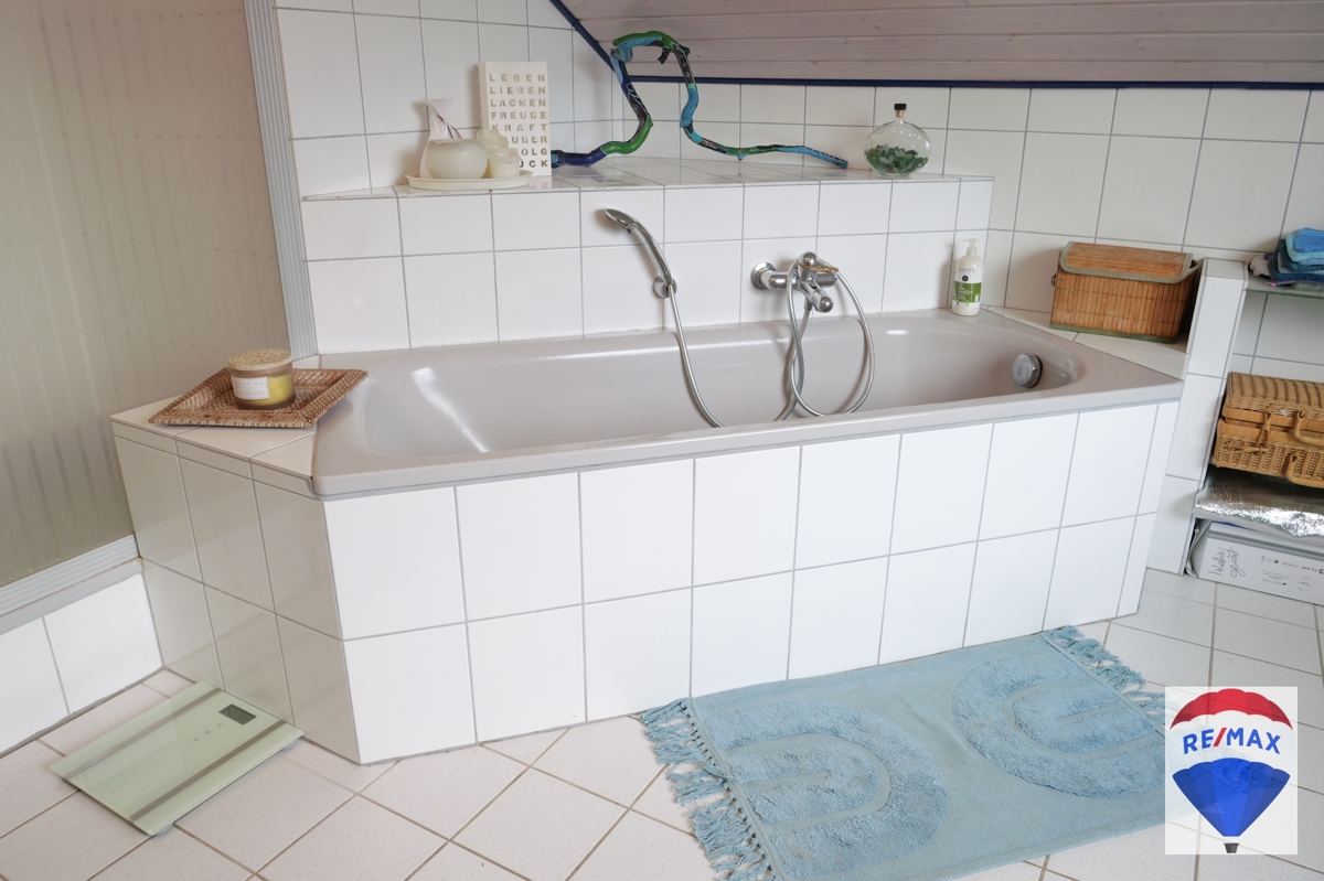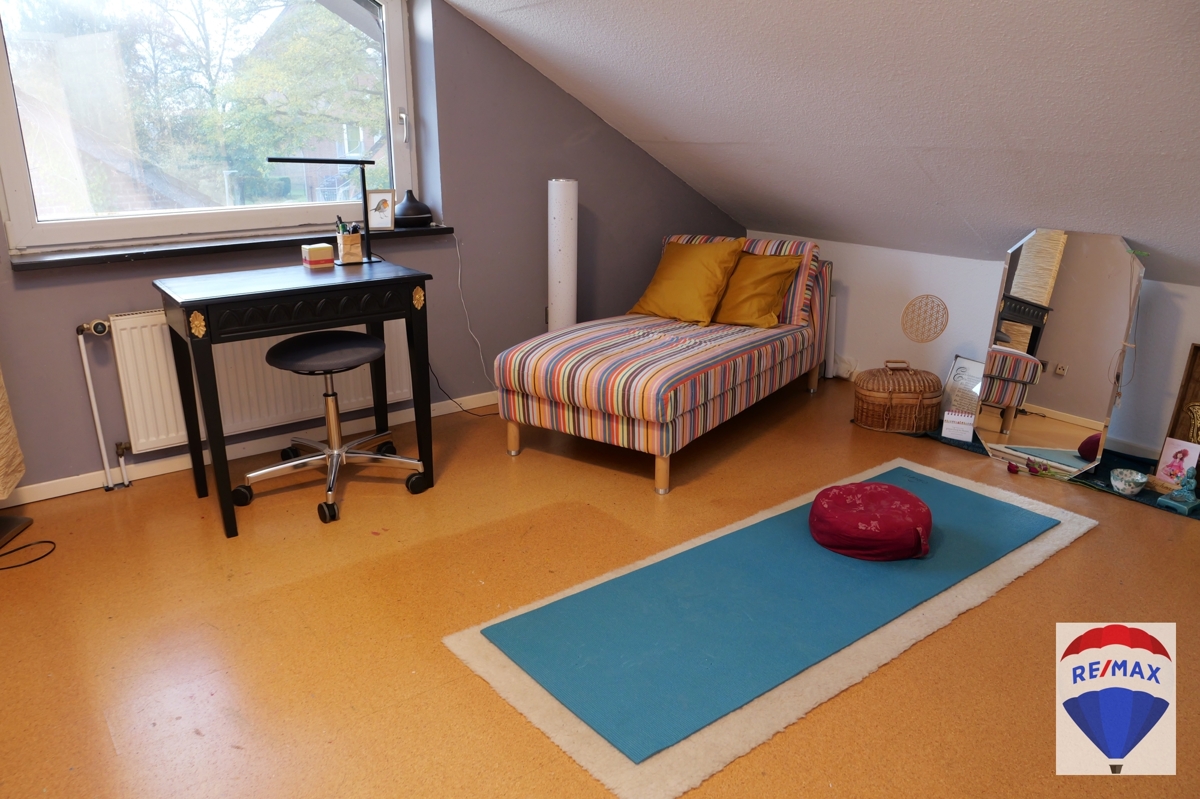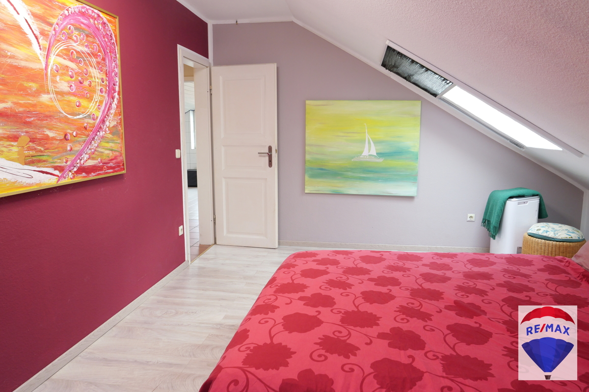 Über die schöne Buchentreppe gelangen Sie ins Obergeschoss. Dieses beherbergt drei großzügige Räumlichkeiten zur individuellen Nutzung, evtl. Kinderzimmer, Schlafzimmer, Gästezimmer oder Büro. Ein Schlafzimmer verfügt über eine Klimaanlage. Komplettiert wird diese Etage durch das hochwertig ausgestattete Badezimmer mit schöner Badewanne, WC, Urinal, Handwaschbecken und Dusche. Das Bad wurde mit einem praktischen Wäscheschacht ausgestattet.
