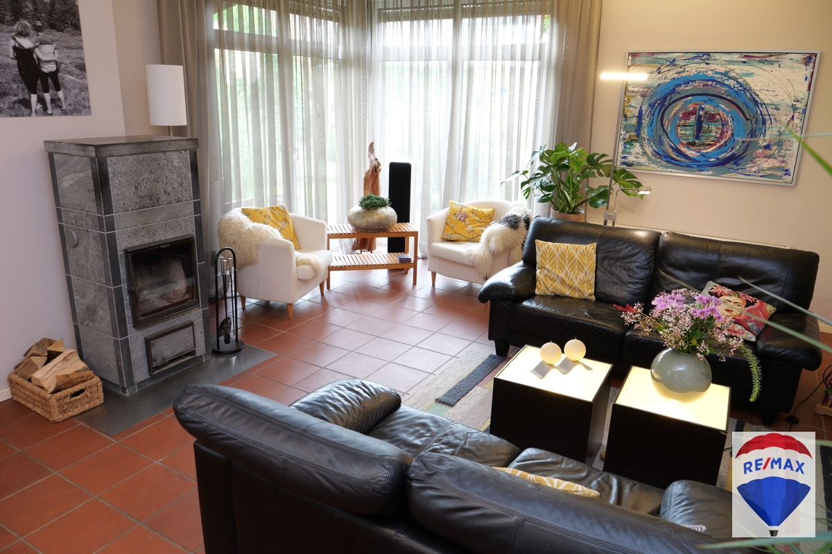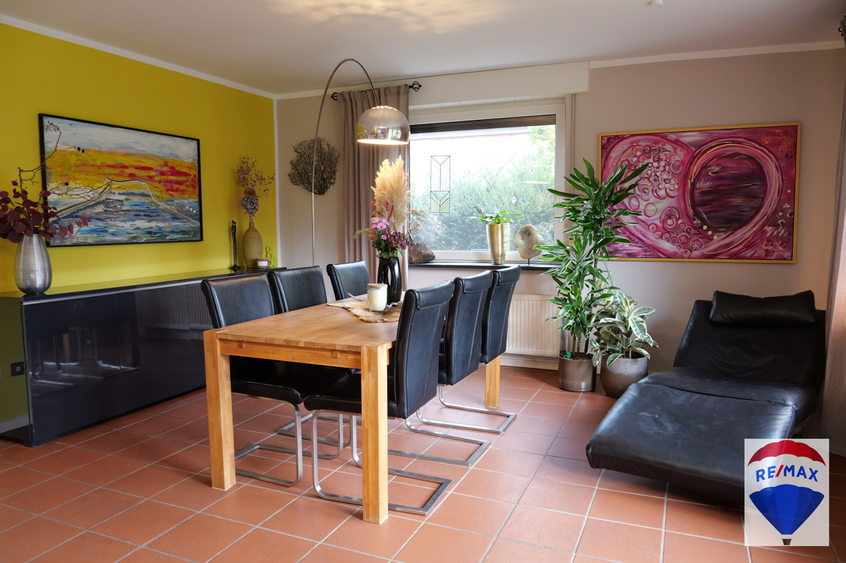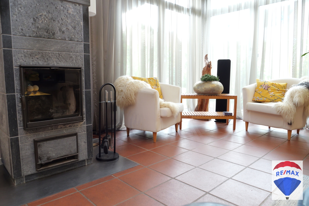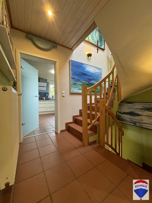 Von einem hellen Eingangsbereich mit Treppen Auf- und Abgang gelangt man in den Küchenbereich. Die weiße und beidseitig bestückte Einbauküche kann optional von den jetzigen Eigentümern nach Absprache übernommen werden. Den Mittelpunkt des Erdgeschosses bildet zweifelsfrei das angrenzende, großzügige Wohn- und Kaminzimmer, derzeit als Esszimmer genutzt. Dieser Bereich wurde durch 2 Stufen in 2 Ebenen unterteilt. Ein großes Fenster über Eck und mehrere bodentiefe Fenster lassen den Raum hell und freundlich erstrahlen. Hier befindet sich ebenfalls der Ausgang auf die Terrasse. Der finnische Specksteinofen der Marke Tulikivi verleiht der Räumlichkeit eine tolle Wohnatmosphäre. Ein Gäste-WC im aktuellen Stil befindet sich ebenfalls auf dieser Ebene. Diele, Küche, Gäste-WC und das Wohn-Esszimmer wurden mit mediterranen, italienischen Terrakottafliesen bestückt. Praktischerweise existiert auf dieser Etage noch ein Abstellraum.
