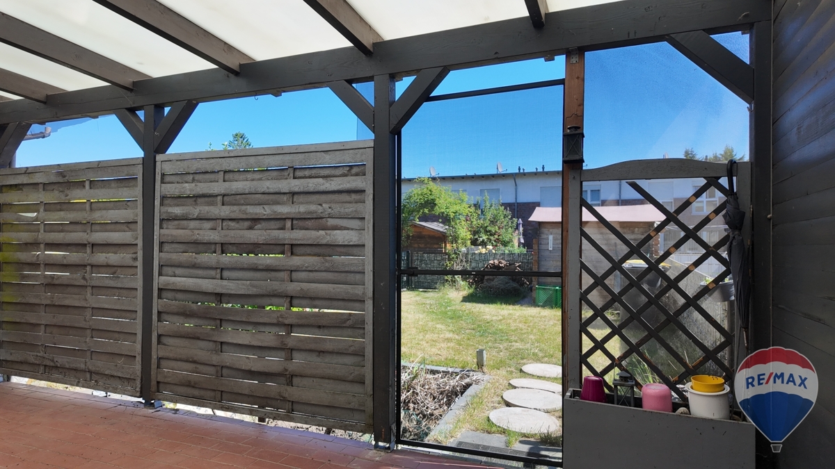 Die Terrasse mit Gartenüberdachung aus Holz ist der perfekte Rückzugsort für entspannte Abende, während der Garten genug Platz für kreative Gartenideen bietet.