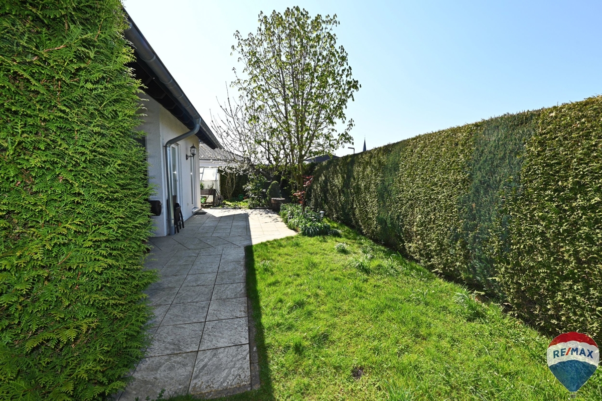 Die blickgeschützte Terrasse, die in den Garten führt bietet genügend Platz für eine Sitzgruppe, um sonnige Tage im Freien zu genießen. Der Garten ist von gut gepflegten Hecken eingefasst und eignet sich als privater Rückzugsort und bietet zusätzlich Platz für ein kleines Gewächshaus.