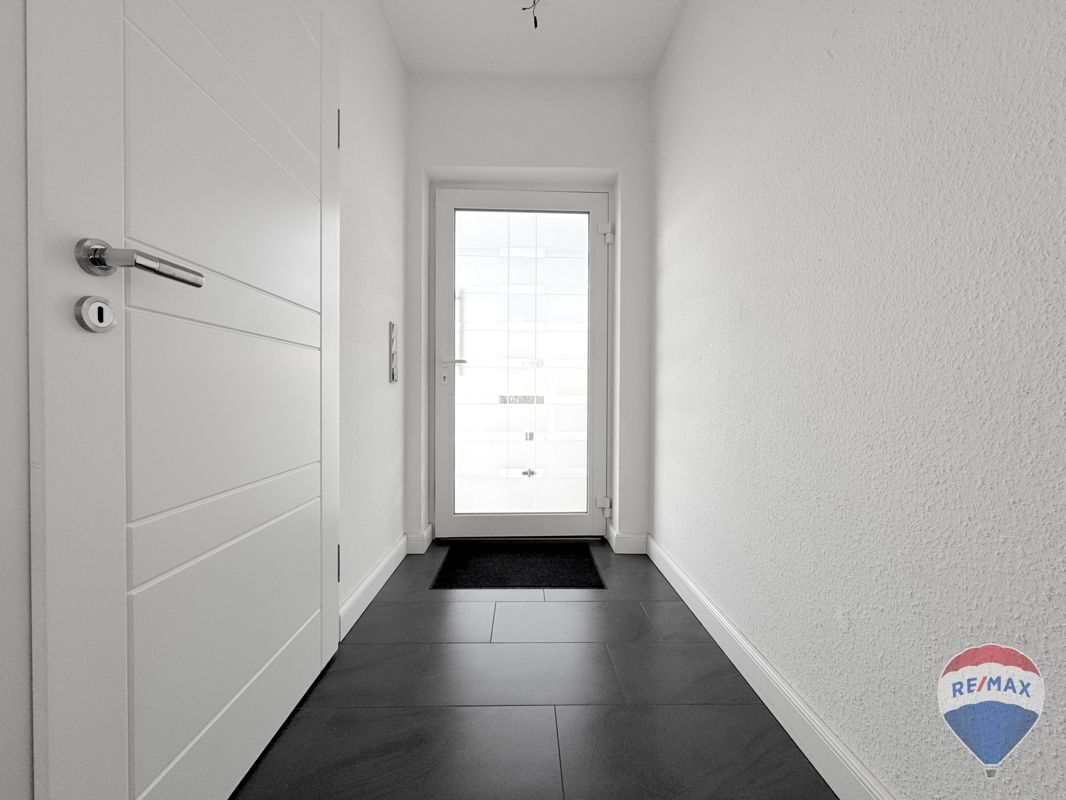 Zwei separate Hauseingänge befinden sich im Erdgeschoss, das Obergeschoss ist über eine attraktive Außentreppe erreichbar. Jede Erdgeschosswohnung verfügt über einen Terrassenbereich, das großzügige Obergeschoss glänzt mit einem Sonnenbalkon.