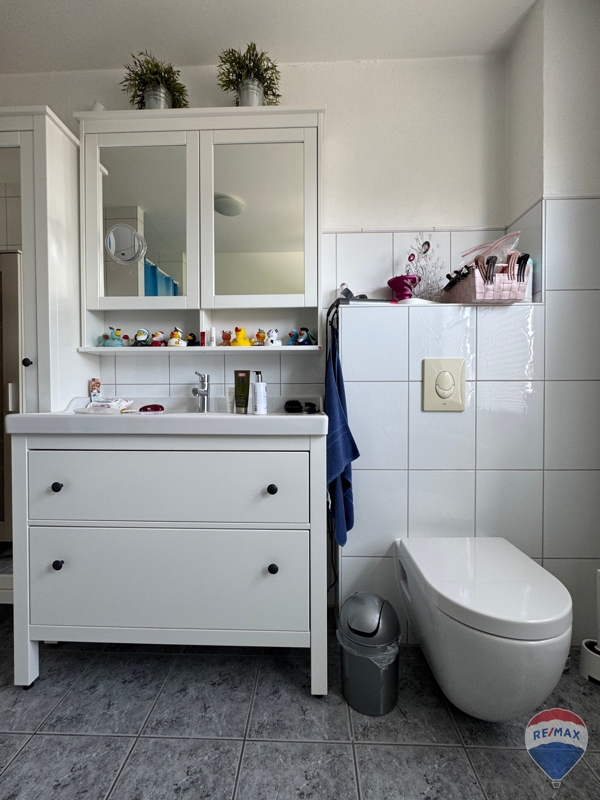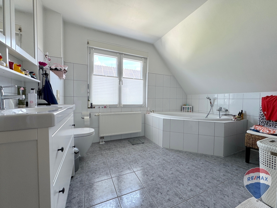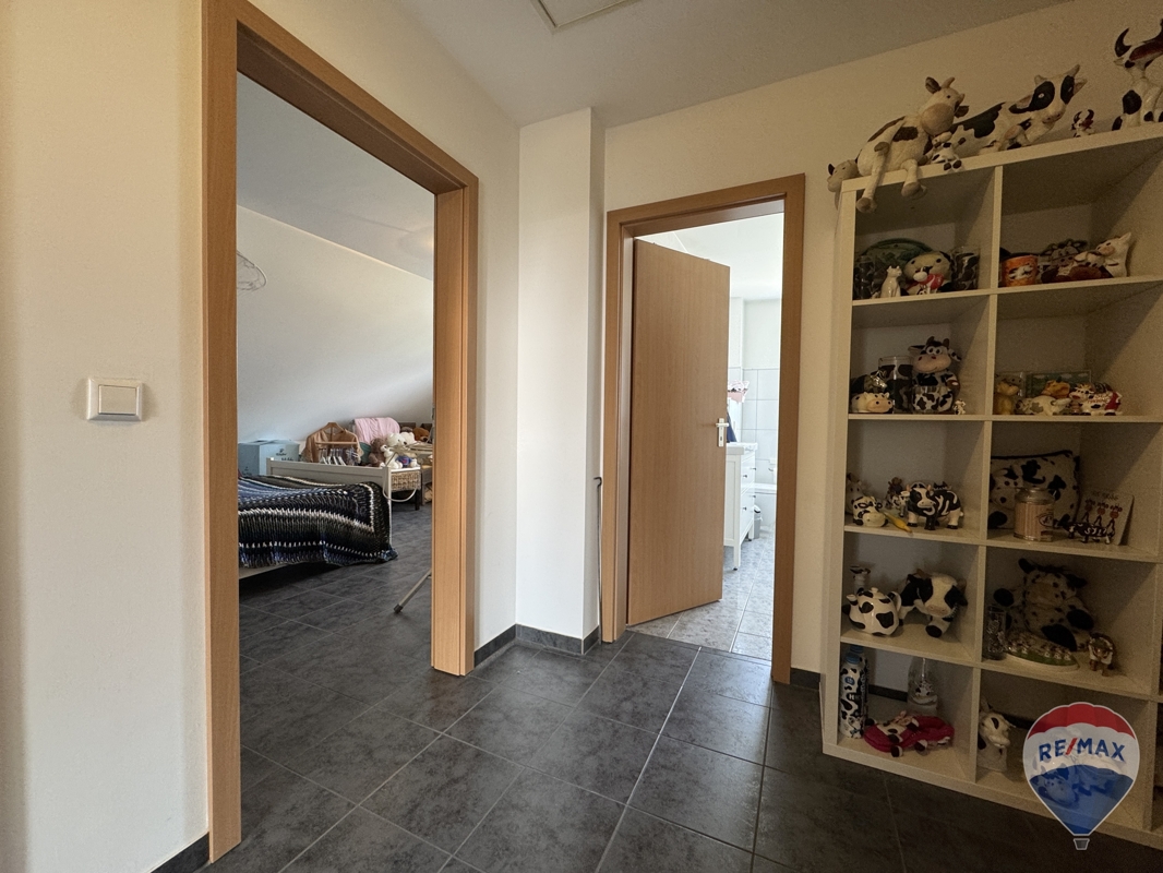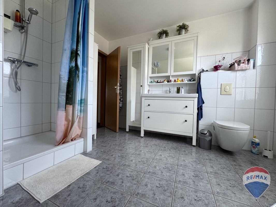 Über eine Holztreppe aus Buchenoptik gelangen Sie ins Obergeschoss. Dieses beherbergt einen Dielenbereich, 3 Räumlichkeiten zur individuellen Nutzung und das moderne Vollbad. Dieses wurde folgendermaßen ausgestattet: