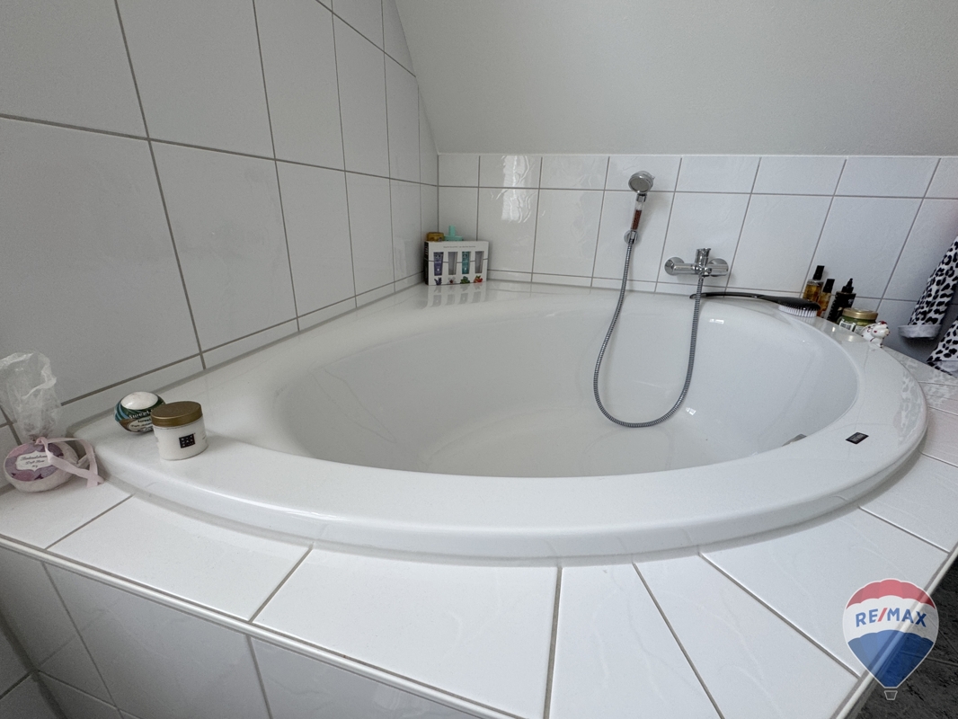 WC, Handwaschbecken mit Badmöbel, Dusche und eine Eckbadewanne.