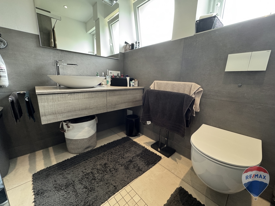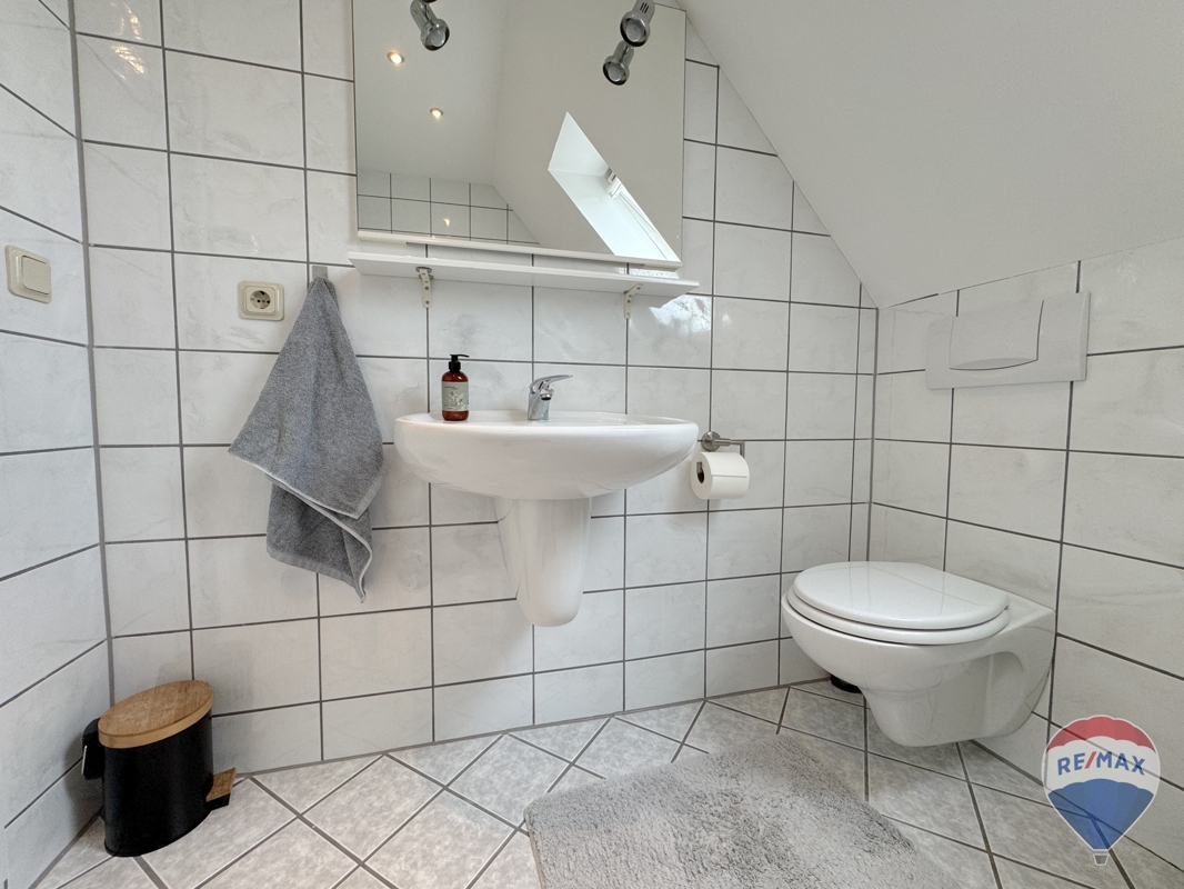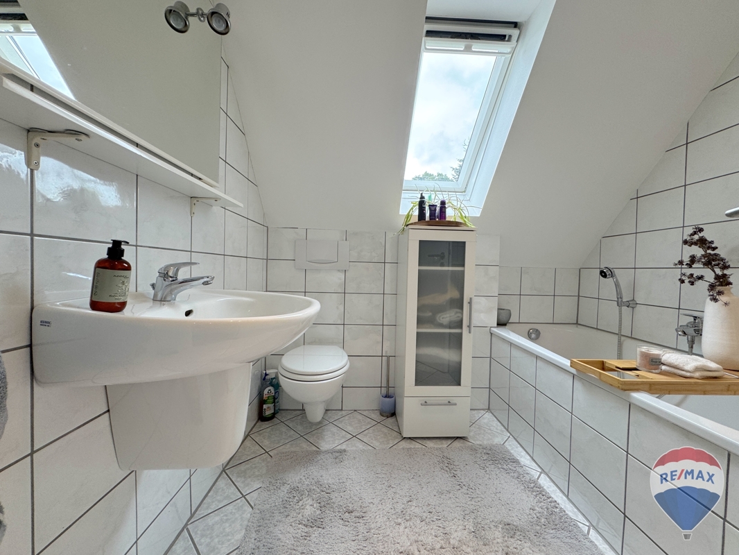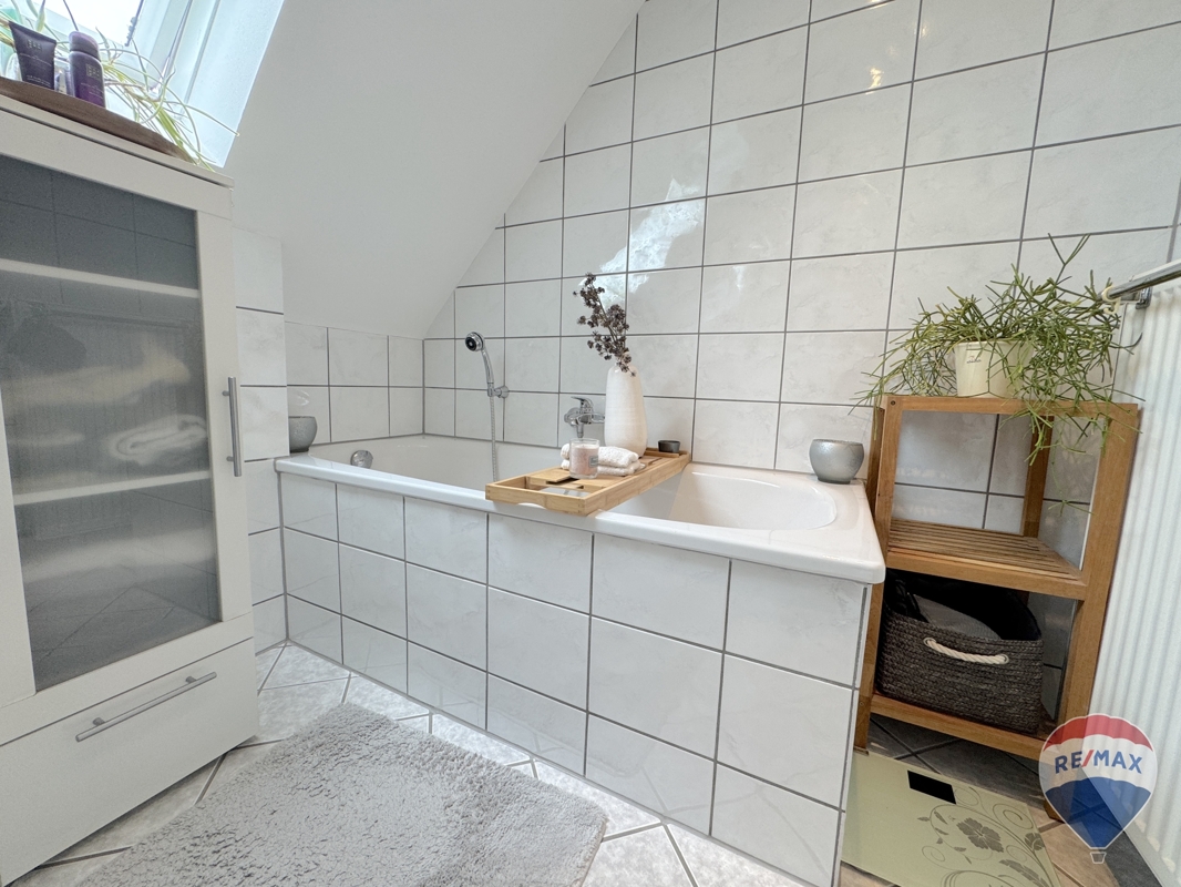 Das Badezimmer im Obergeschoss verfügt u.a. über eine Badewanne. Die lichtdurchfluteten Schlafräume wurden mit Laminatboden bestückt und ein Schlafraum hat den direkten Zugang zum Sonnenbalkon.