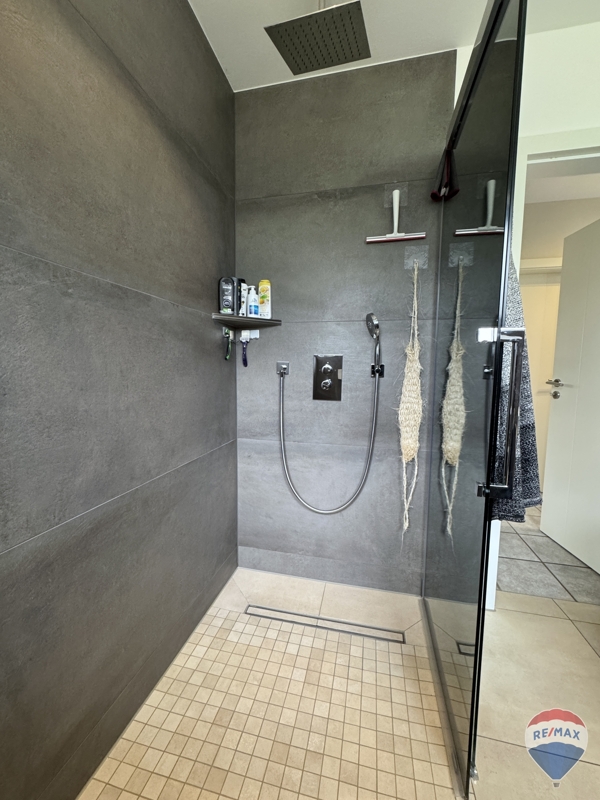 Das Wohn-Esszimmer verfügt insgesamt über ca. 36 m², wurde mit hellem Fliesenboden ausgestattet und verfügt über einen Ausgang zur Terrasse. Die Einbauküche, 2-seitig bestückt, kann optional von den jetzigen Eigentümern übernommen werden. Das moderne Badezimmer im Erdgeschoss wurde folgendermaßen ausgestattet: Handwaschbecken, WC und barrierefreie Dusche.