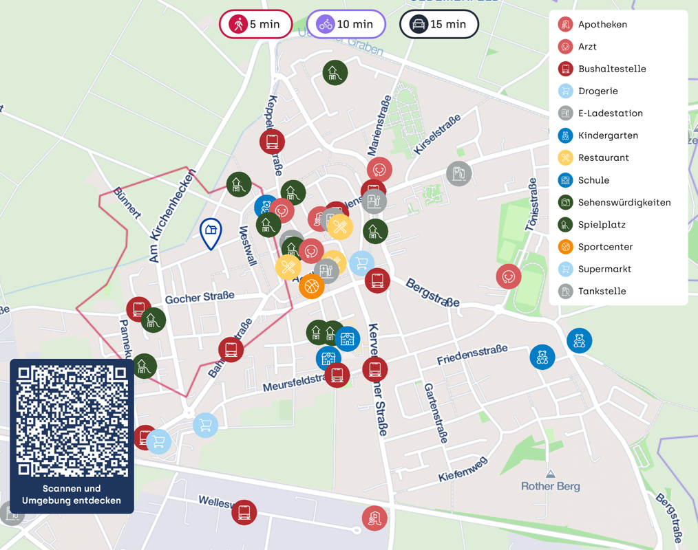 Diese Immobilie in Uedem bietet eine hervorragende Lage mit einer Vielzahl von Annehmlichkeiten in der Nähe. Für Familien ist die Nähe zu Bildungseinrichtungen besonders attraktiv. Die Freie Waldorfschule Niederrhein und die Geschwister-Devries-Schule sind beide in wenigen Gehminuten erreichbar. Auch für die Kleinsten ist gesorgt, mit dem Franziskus Kindergarten in unmittelbarer Nähe.