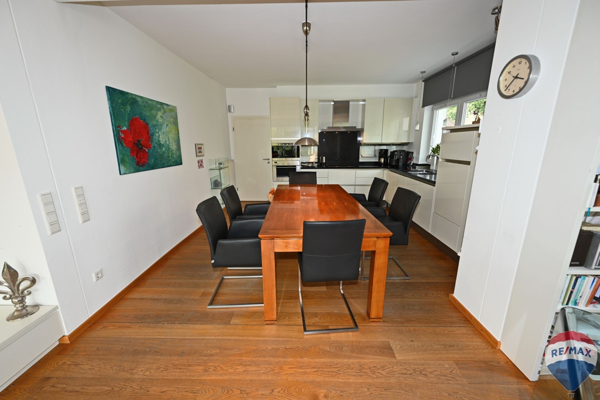 Das Erdgeschoss verzaubert mit seinem einladenden Holzboden, einem geräumigen Flur und einem durchdachten Grundriss. Das Schlafzimmer (ca. 20,59m²) verfügt über ein bodentiefes Fenster sowie einen Einbauschrank. Die hochglanzweiße Küche öffnet sich zu einem Essbereich (ca. 17,08m²) und einem weitläufigen Wohnzimmer (ca. 45,61m²) mit großer Fensterfront, die viel Tageslicht hereinlässt. Hier können Sie am gemütlichen Kamin entspannen. Von hier aus gelangen Sie auch in den Hauswirtschaftsraum und in die eigene Garage. Die angrenzende Terrasse mit Markise lädt zum Verweilen ein und bietet Zugang zu einem pflegeleichten Garten, der den Bewohnern des Erdgeschosses vorbehalten ist.