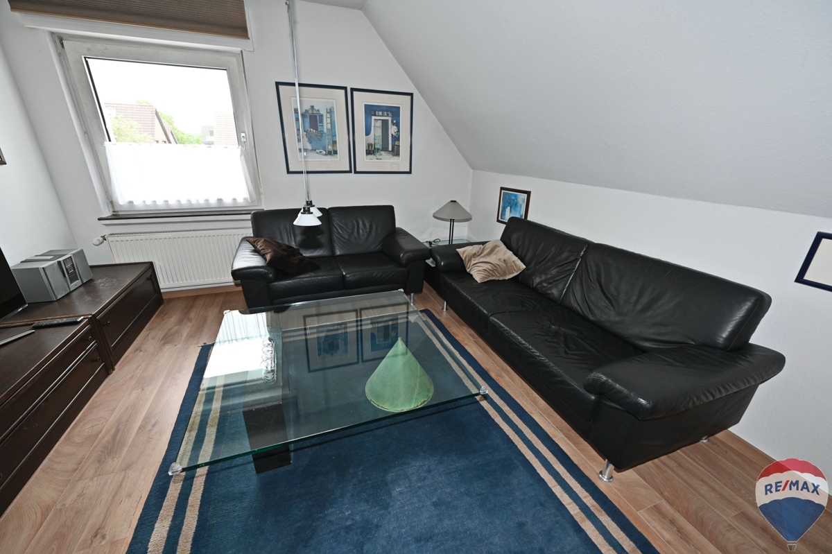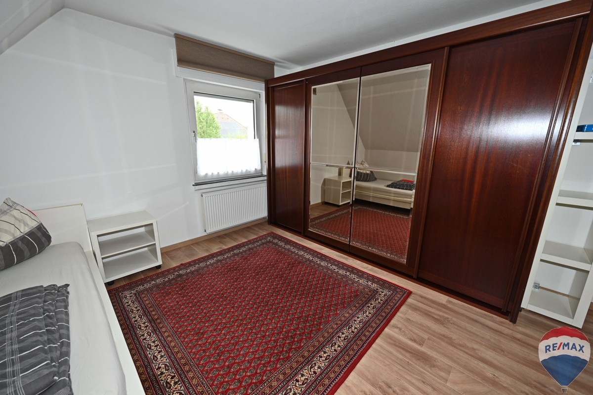 Eine Besonderheit dieses Hauses ist die Einliegerwohnung im Obergeschoss, die über einen eigenen Eingang ebenso wie eine separate Garage verfügt. Diese Wohnung umfasst ein Gästezimmer, ein Wohnzimmer, ein Schlafzimmer, eine praktische Küche im Holzdesign sowie ein Badezimmer mit Dusche und Waschmaschinenanschluss. Ein Dachfenster sorgt hier für genügend Tageslicht.