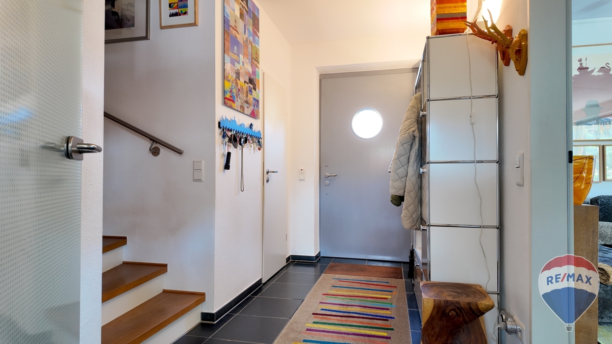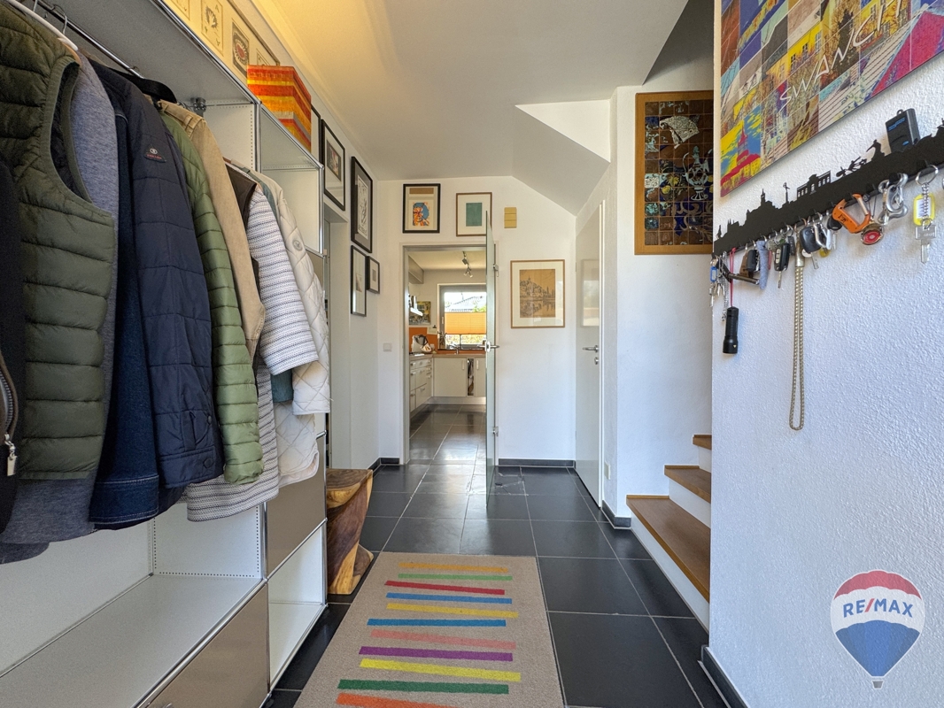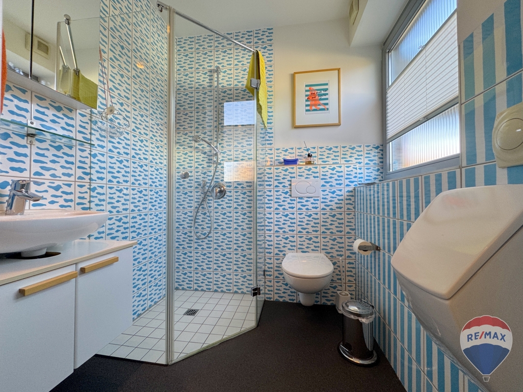 Die architektonisch wertvolle räumliche Gestaltung präsentiert sich auf jeder Ebene. Die Wohnfläche in einer Größenordnung von ca. 145 m² versteht sich inklusive der Terrassen- und Balkonfläche. Schon beim Betreten der Diele lässt sich die Gepflegtheit und Helligkeit des Objektes erahnen. Das praktische Gäste-WC wurde folgendermaßen ausgestattet: WC, Urinal, Handwaschbecken und Dusche.