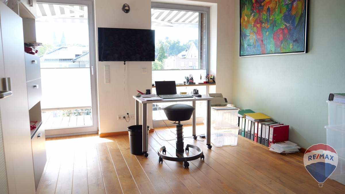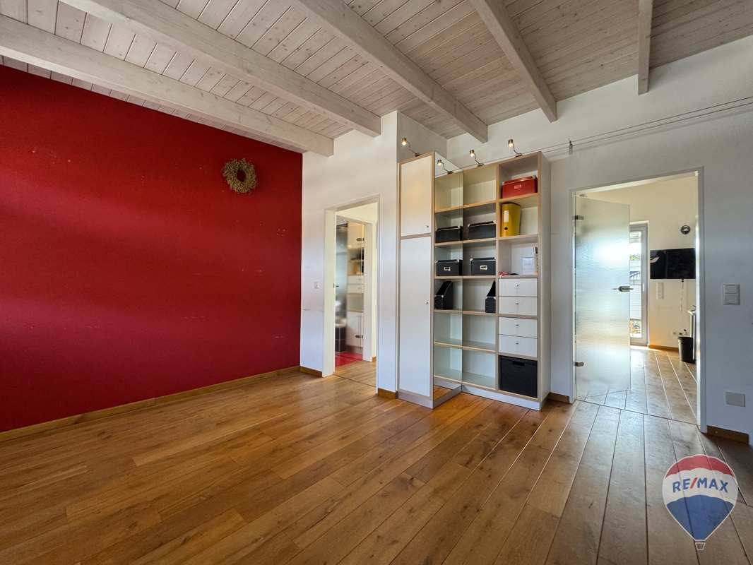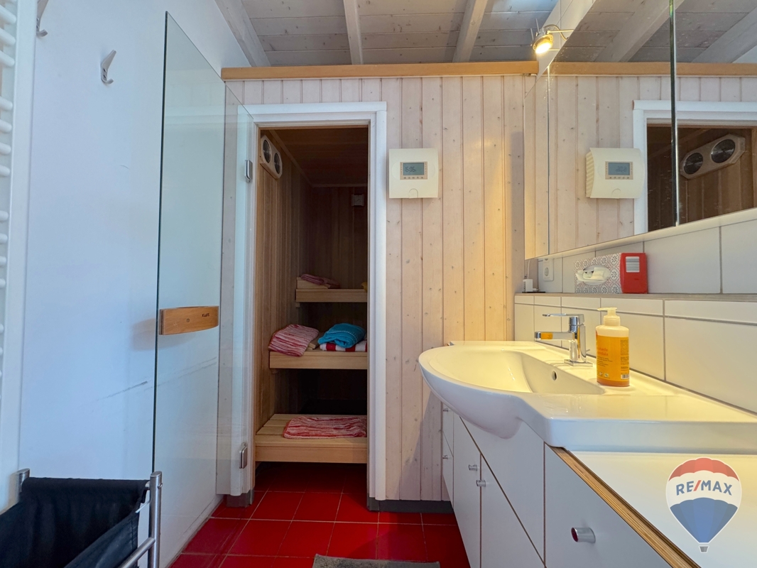 Das Obergeschoss beherbergt eine geräumige Galerie, das Badezimmer mit angrenzendem Saunabereich und zwei individuell zu nutzende Räumlichkeiten. Es besteht die Möglichkeit die Galerie noch zu schließen und zum 3. Schlafraum zu nutzen. Das Badezimmer ist eine echte Wellnessoase mit Handwaschbecken, Badmöbel, WC, Badewanne und barrierefreier Dusche. Angrenzend befindet sich praktischerweise der Saunabereich. Ein derzeitig genutztes Schlafzimmer verfügt über einen geräumigen Einbauschrank. Hier befindet sich der Ausgang auf den Sonnenbalkon, der mit einer Markise versehen wurde. Der Balkon streckt sich über die Gesamtlänge des Hauses und somit profitiert auch das derzeitig genutzte Arbeitszimmer. Das komplette Obergeschoss wurde mit hochwertigem Parkettboden ausgelegt, ausgenommen natürlich das Badezimmer.