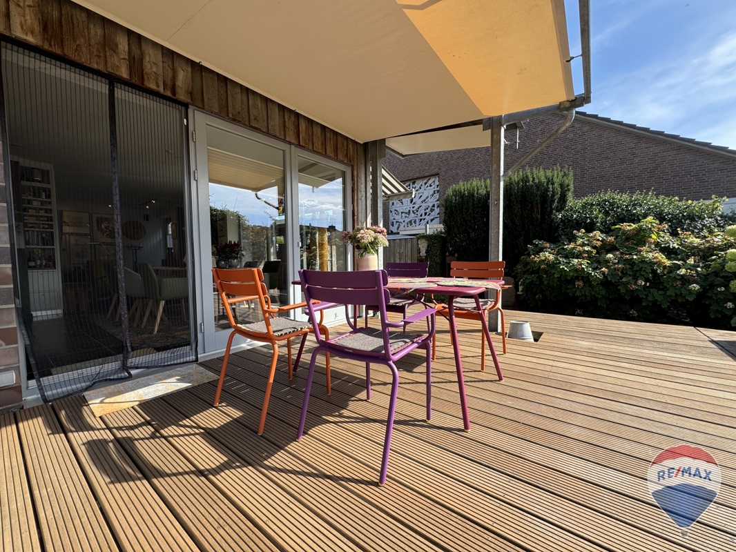 Eine großzügige Terrasse, größtenteils überdacht, verspricht Ruhe und Erholung.
