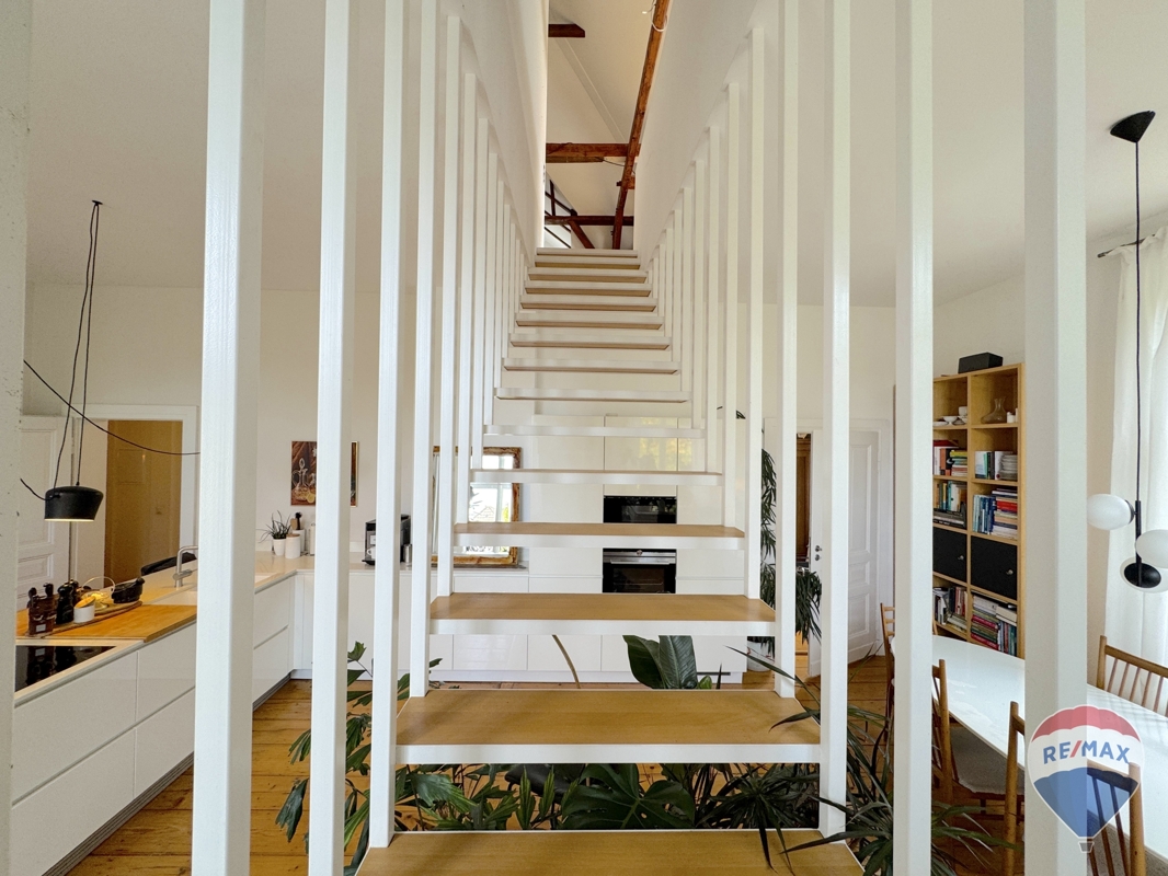 Das Dachgeschoss, begehbar über die imposante Treppenanlage, beherbergt den großzügigen Schlafbereich mit imposanter Balkenlage. Ein Bad in Spee wurde hier vorbereitet.