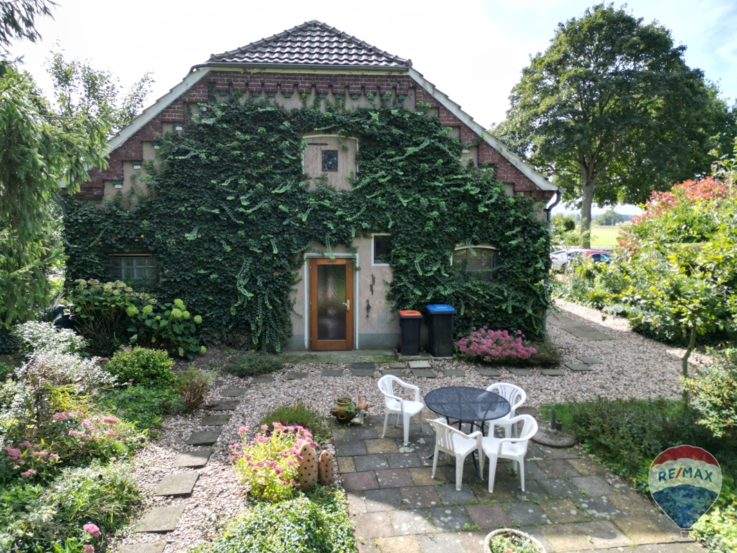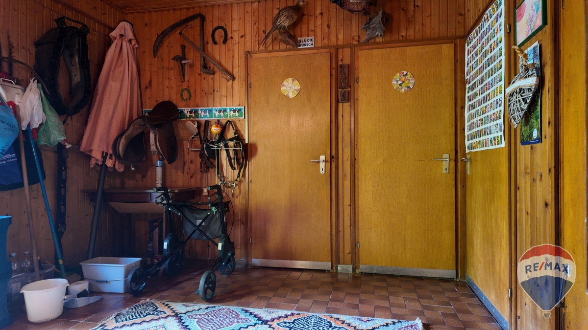 Der Außenbereich ist ein Paradies für Naturliebhaber und Hobbygärtner. Die weitläufigen Obstwiesen und Bereiche für Gemüseanbau bieten zahlreiche Möglichkeiten für einen nachhaltigen Lebensstil. Der ehemalige Hühnerstall kann vielfältig genutzt werden, während die vorhandene Infrastruktur die Möglichkeit der Pferdehaltung eröffnet. Eine großzügige Terrasse lädt zum Entspannen und Genießen der idyllischen Umgebung ein.