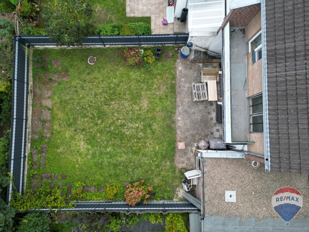 Der Garten verfügt über eine Rasenfläche und einen Pflanzstreifen, der mit Blumenrabatte gestaltet wurde.
