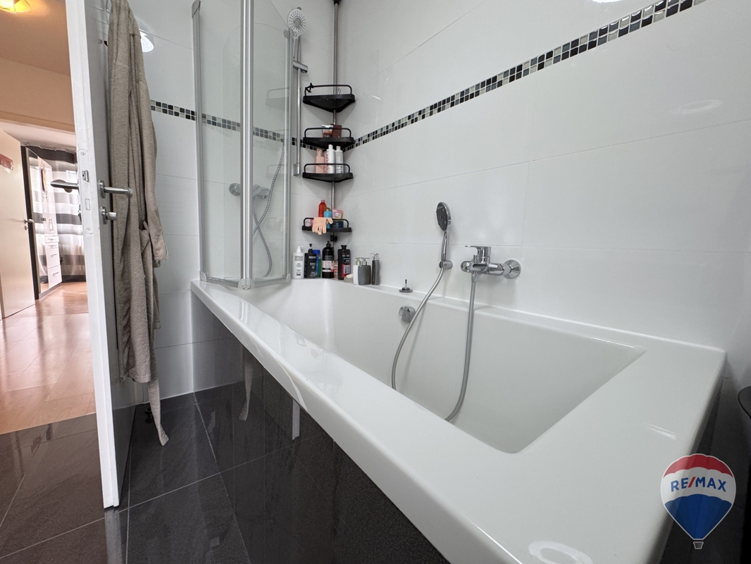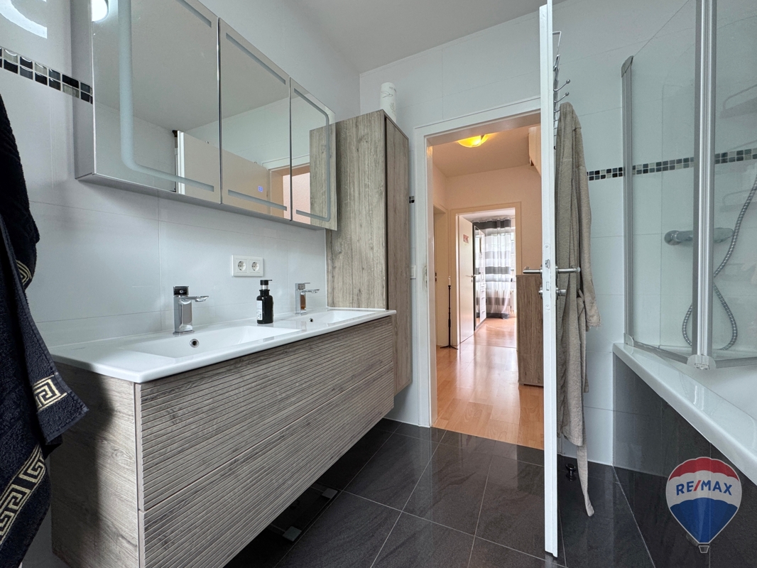 Zwei Handwaschbecken, Badmöbel, WC und eine Badewanne mit Duschkombination. Zwei Schlafräume gewähren Ihnen den Zugang zum Sonnenbalkon.