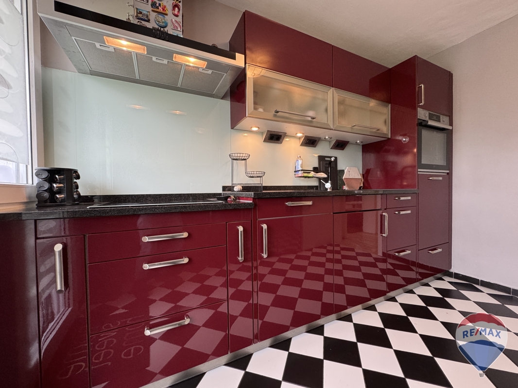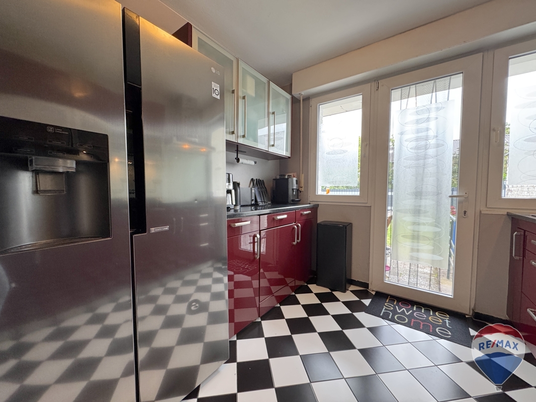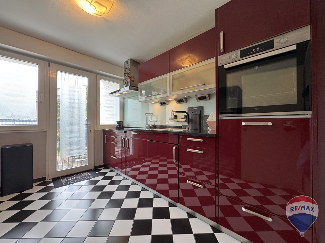 Die Einbauküche wurde zweiseitig bestückt und kann optional von den jetzigen Eigentümern nach Absprache übernommen werden. Der Boden wurde im Schachbrett-Muster gestaltet. In der Küche befindet sich ebenfalls der Ausgang zur Terrasse und führt Sie weiter in den Garten.